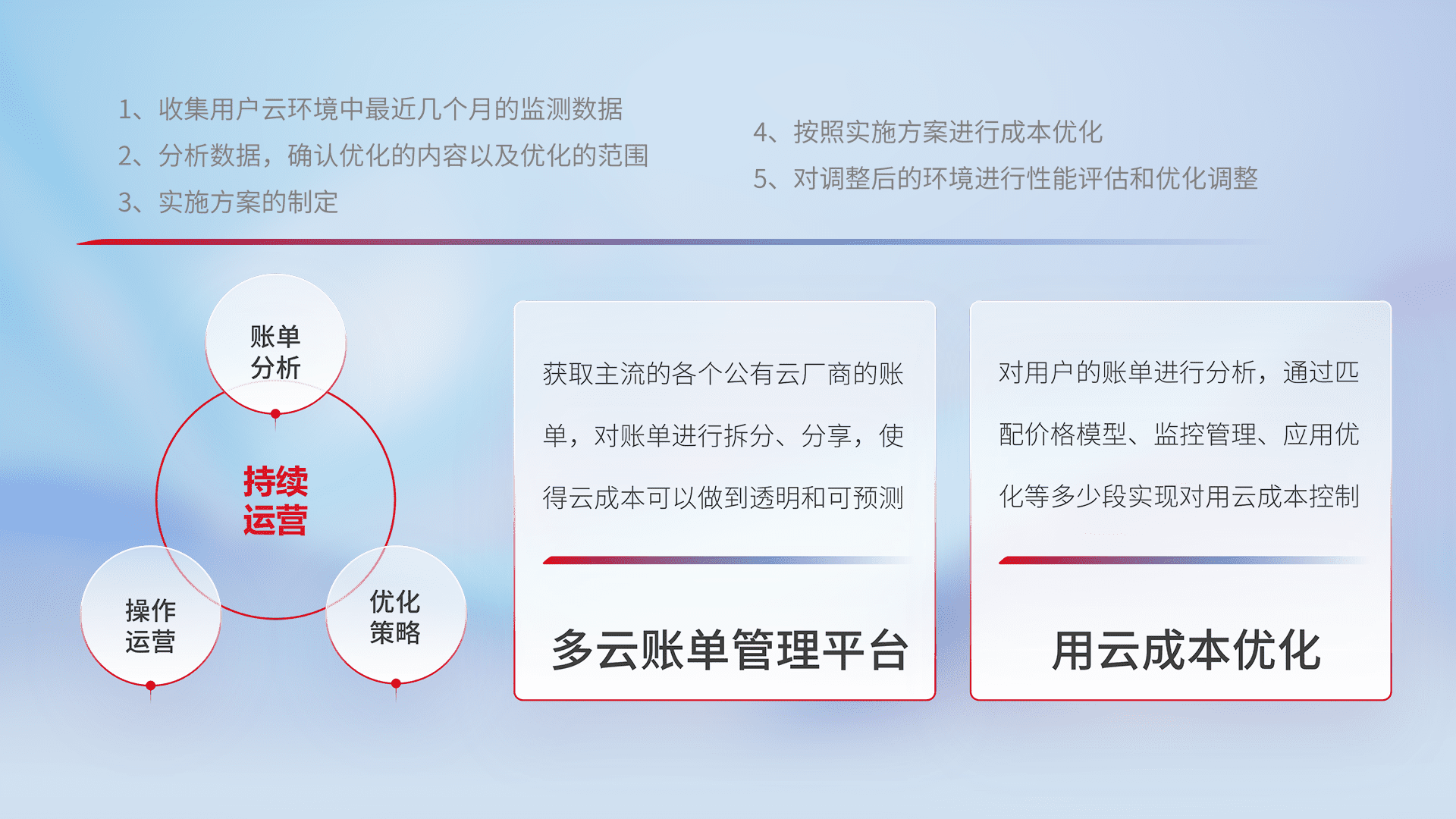 通过多云纳管,,,,以统一的资源数据模型把客户的云资源进行抽象和封装,,进而实现对多云资源的统一操作,,,保障云资源管理的可靠性、、稳定性与可用性。。量身定制化运维内容,,,配置、、、、开发运维、、、、补丁管理、、备份、、、、监控、、、认证和访问管理、、、、审计和日常巡检等,,,保障在用云过程中的可靠度,,,,稳定度以及高可用率。。。。